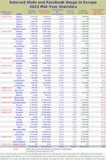 A (1) Penetração da Internet na População mede-se calculando a percentagem de utilizadores da Internet relativamente à população total. Adicionalmente definiu-se a (2) Penetração do Facebook na Internet calculando a percentagem de users do Facebook relativamente aos users da Internet. Definido como viciados no Facebook os países em que (2)>(1). Além da Grécia, Turquia e Portugal, só alguns países com reduzida dimensão se enquadram nesta categoria, que provavelmente indicará uma utilização deficiente de outras ferramentas, a sugerir-nos uma elevada taxa de desemprego a longo prazo.